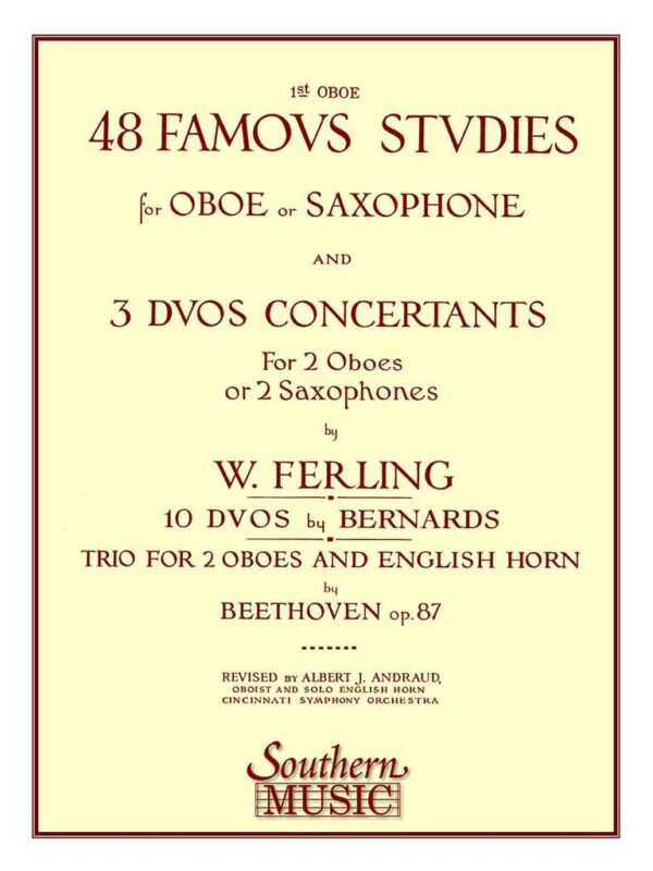 Long established as one of the centerpieces of study repertoire for both the oboe and saxophone. In addition to the 48 famous Ferling studies, it includes 3 Duos Concertantes for two instruments and Trio for two oboes and English horn by Beethoven.