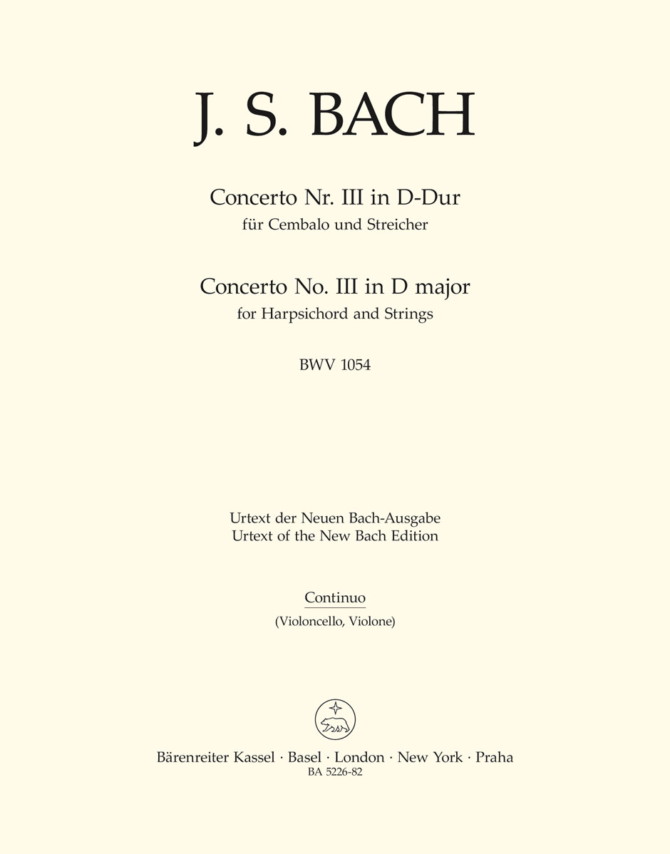 The D-major Concerto, BWV 1054, originated as a transcription of BachÂ’s Violin Concertoin E major, BWV 1042. The principal source for our edition is the autograph score of BachÂ’s harpsichord concertos preserved in the Berlin Staatsbibliothek (Mus. ms. Bach P 234), where BWV 1054 forms the third item. Toaccommodatethe upper limit of the harpsichord keyboard, Bach decided to transpose the piece down a whole tone, which allowed him to retain the frequently occurring peak pitch e3 without altering the melodic line.