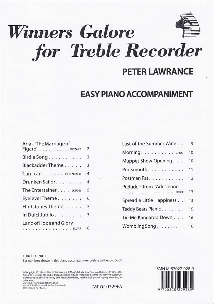 This book contains Piano accompaniments for all 38 pieces featured in Winners Galore For Treble Recorder.